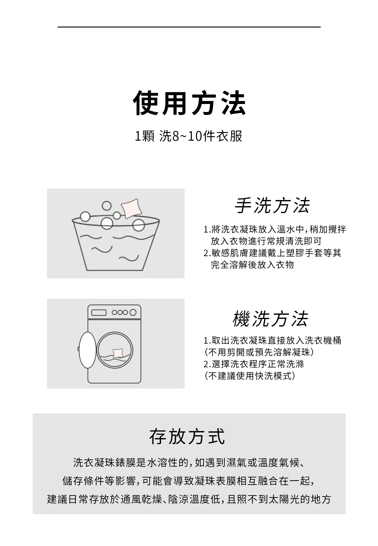 手洗|將凝珠放入溫水中攪拌等其溶解後放入衣物即可