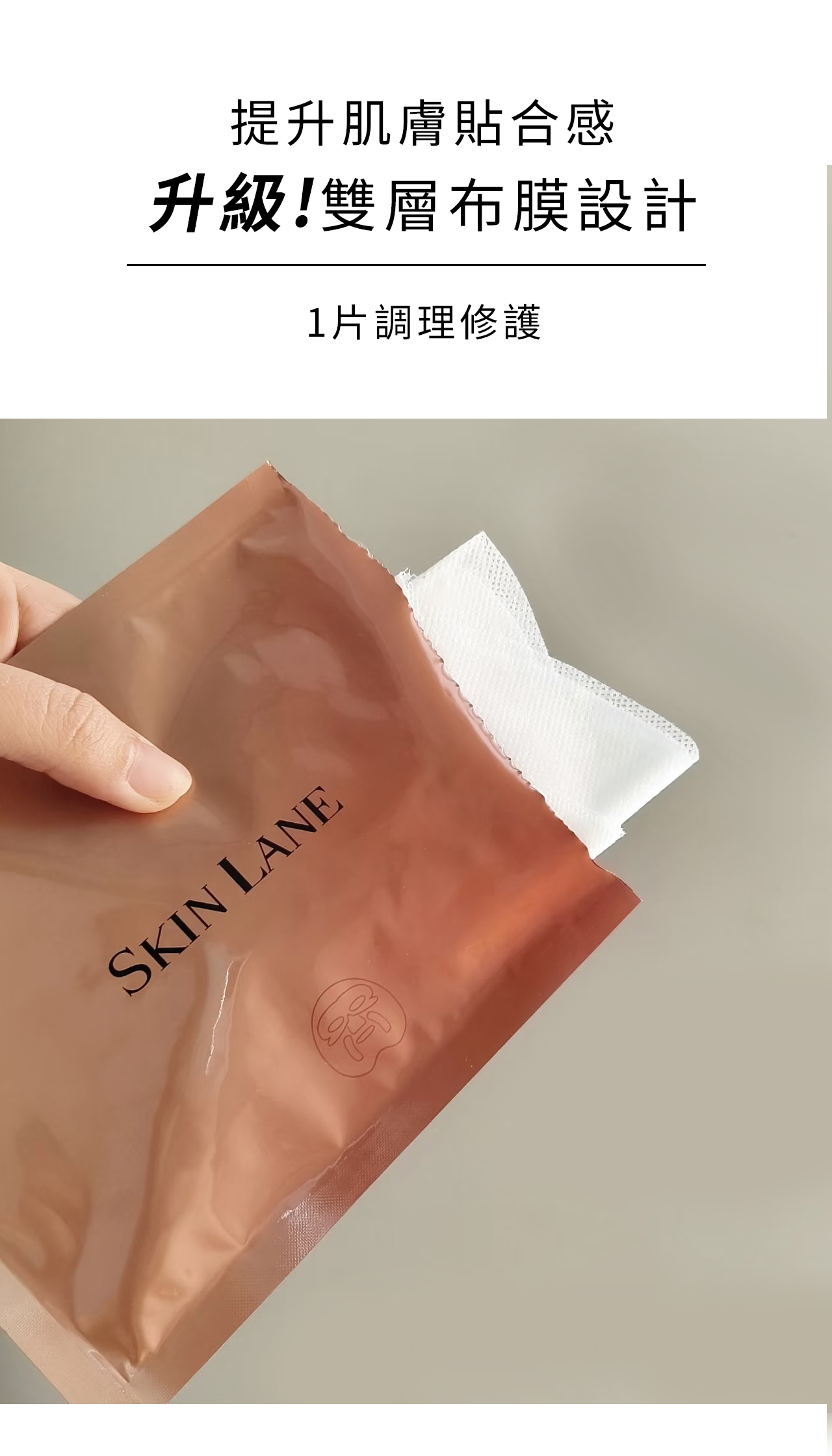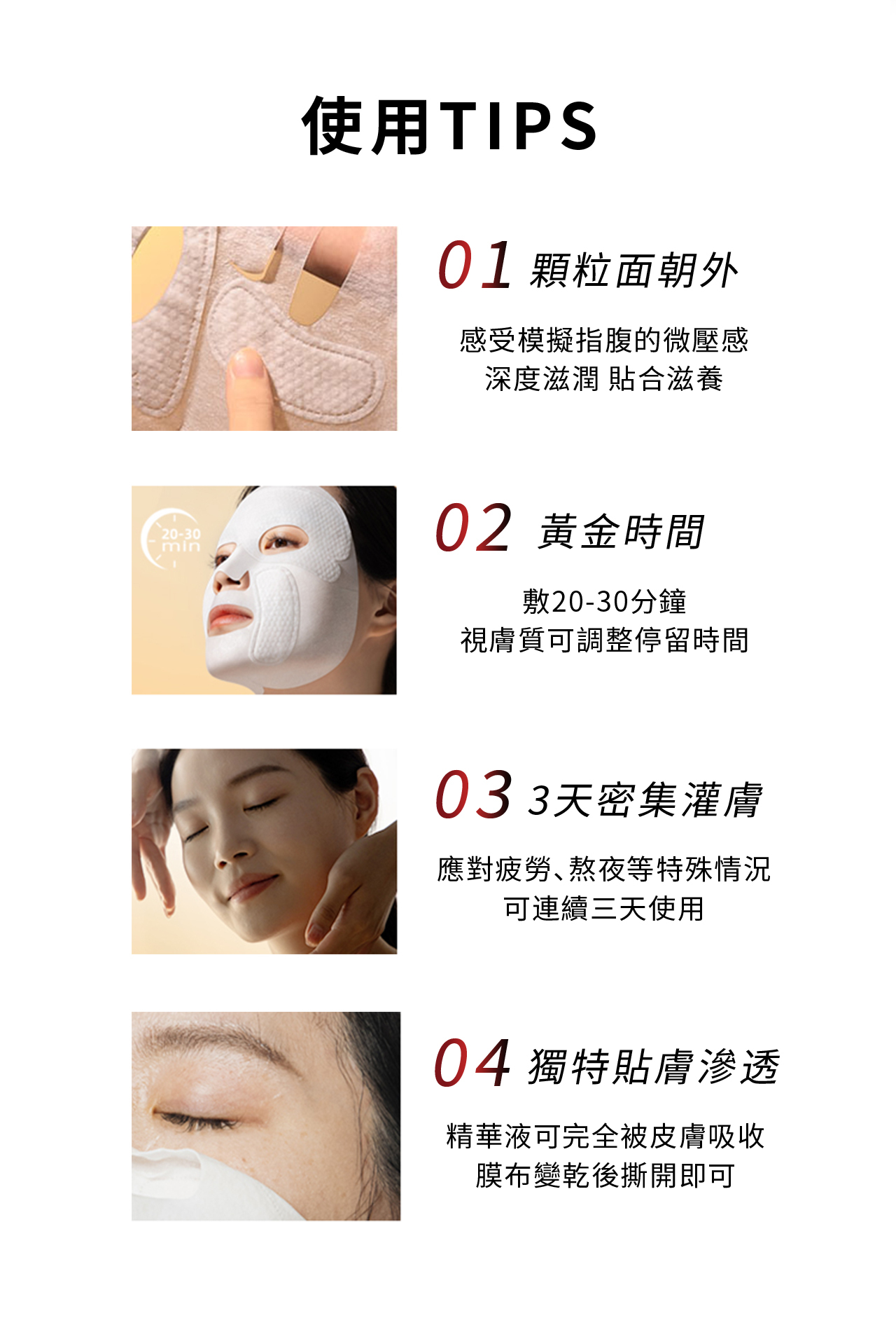 3.輕輕將白色襯布除去,根據臉部輪廓、眼部、口周位置稍作調整,使面膜緊貼面部肌膚