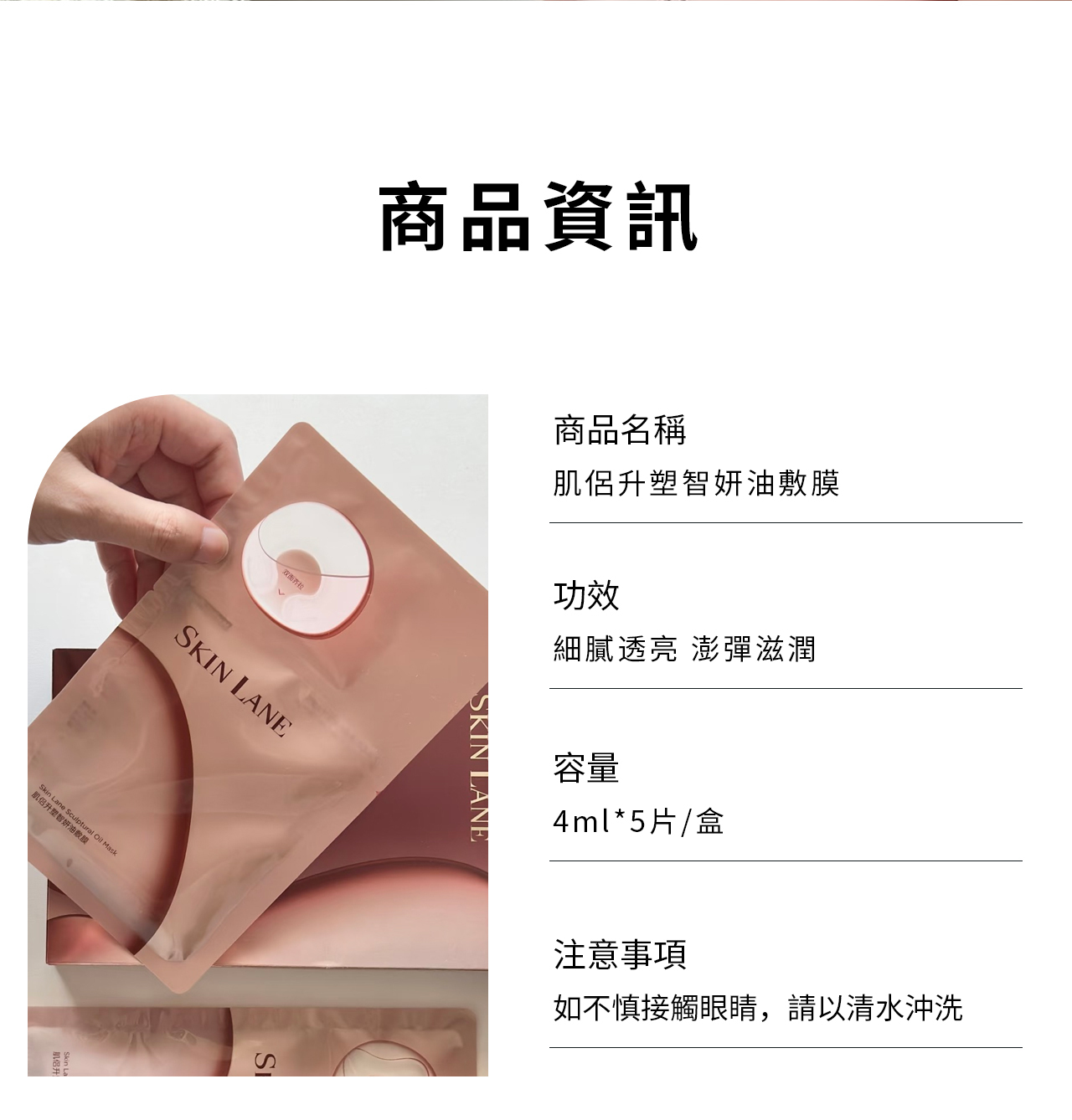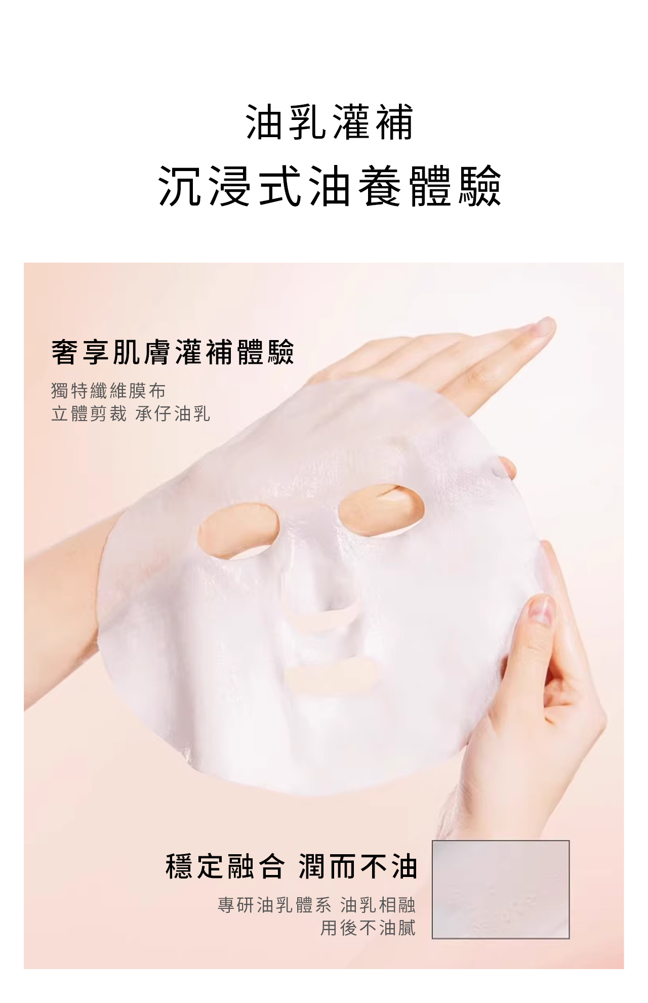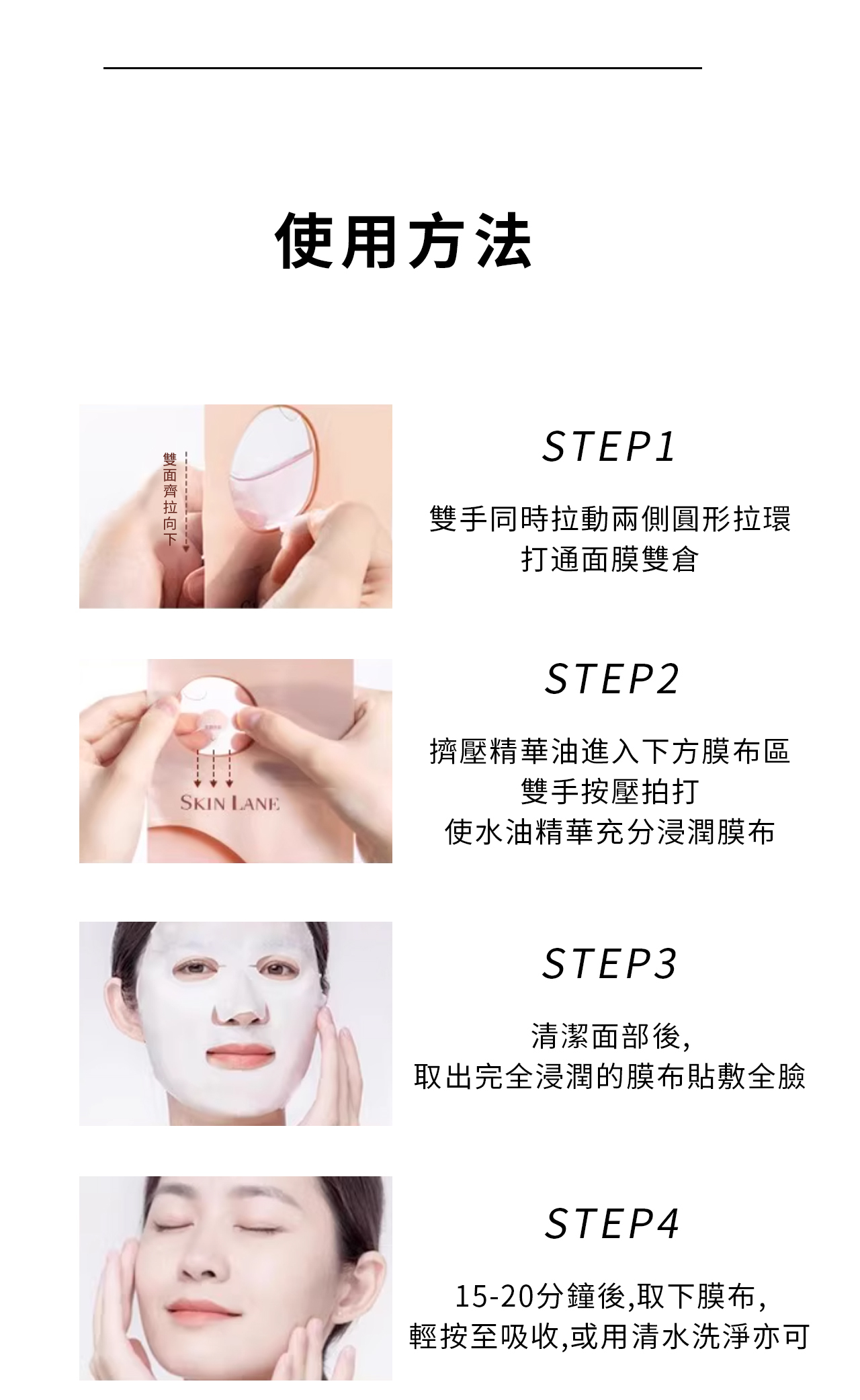 敷上面膜:將面膜敷於臉部,調整位置使其緊貼臉型,此時白色襯布應在外側。